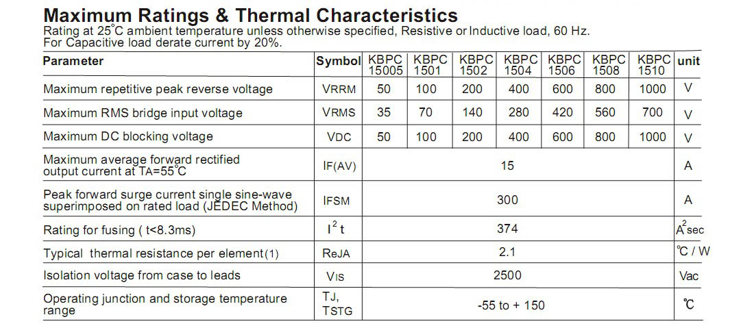 KBPC1510整流桥,参数规格:电流:15A;电压:1000V;盒装:50PCS/盒。