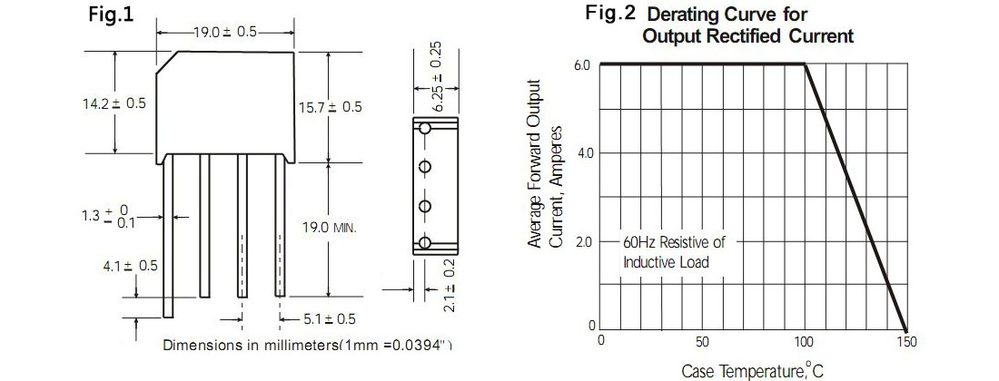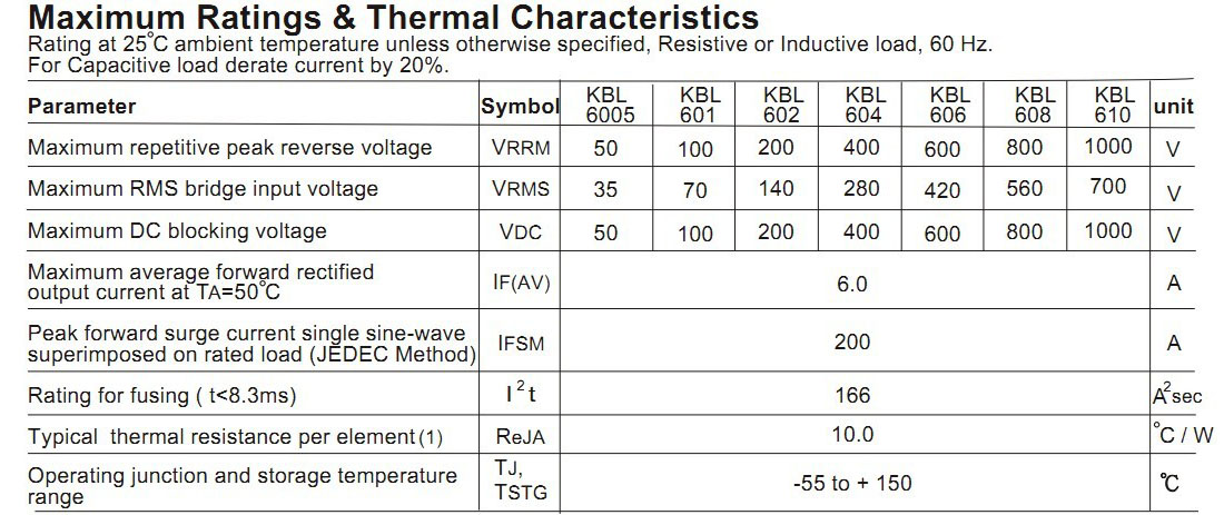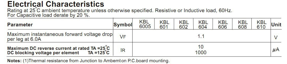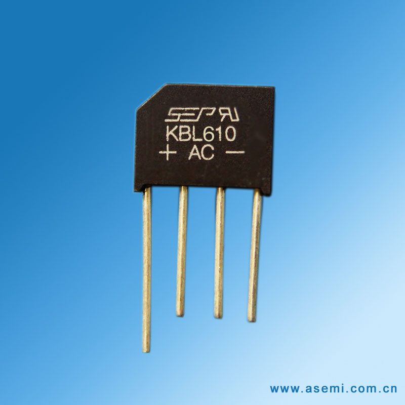 KBL610整流桥(封装 KBL-4 扁桥) 参数规格:电流:6.0A ;电压:1000V ;盒装:500PCS/盒; 5K/箱