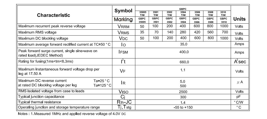 GBPC3510W整流桥,参数规格:电流:35A;电压:1000V;盒装:50PCS/盒。