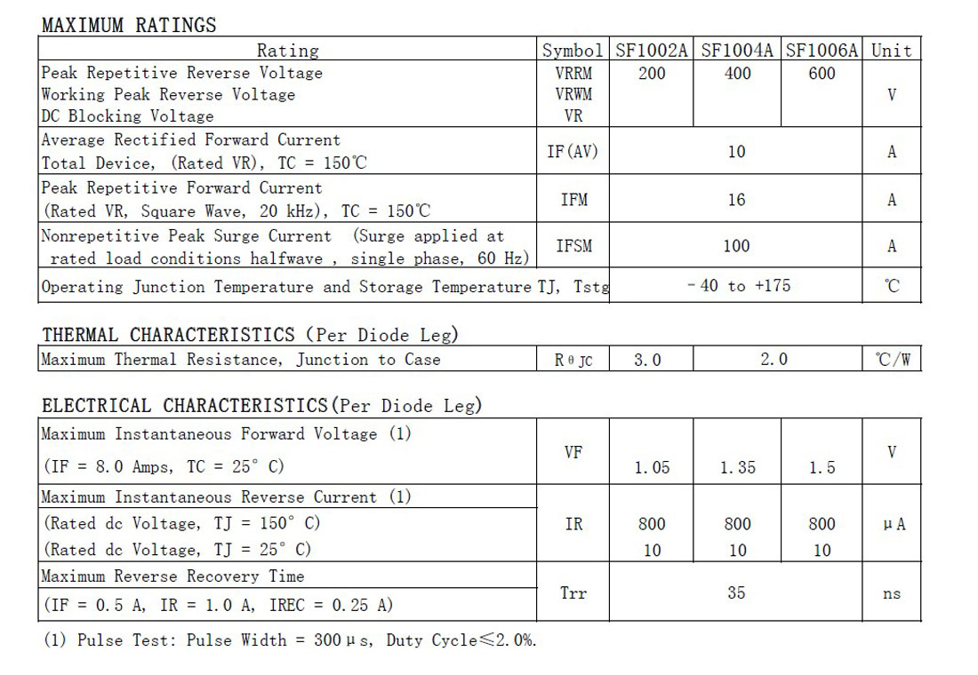 快恢复二极管SFF1006A电流:10A ;