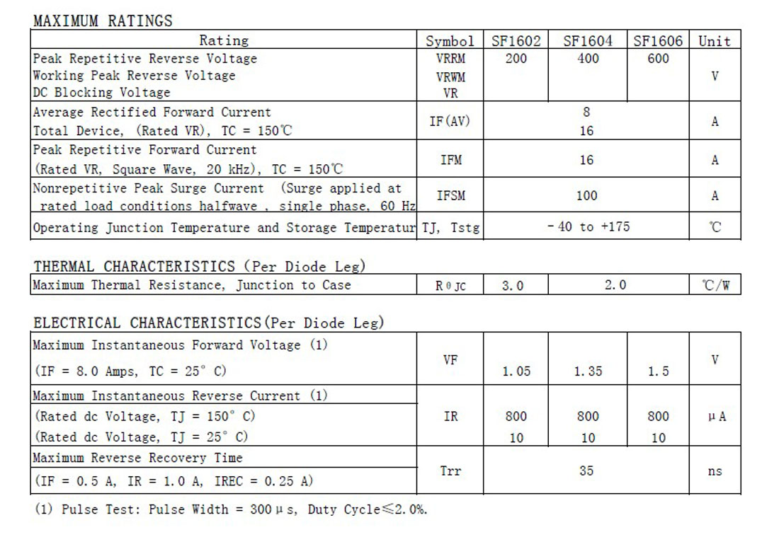 快恢复二极管SFF1606A电流:16A ;