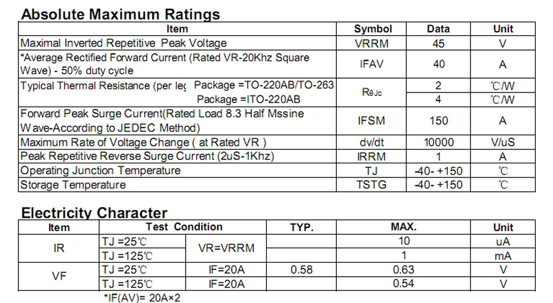 典型参数:40A 45V 正向电流(Io):40A 反向耐压(Vrr):45V