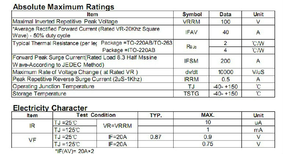 肖特基二极管MBR40100F管装:50/管;盒装:1000PCS/盒。