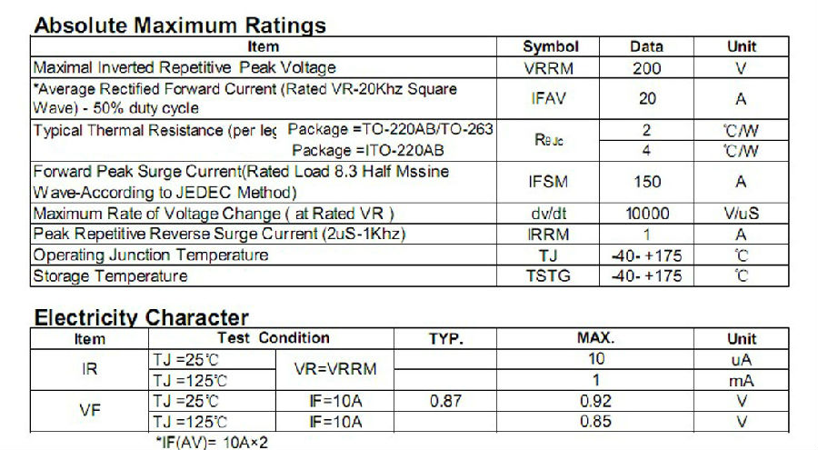 肖特基二极管MBR20200H参数规格:
