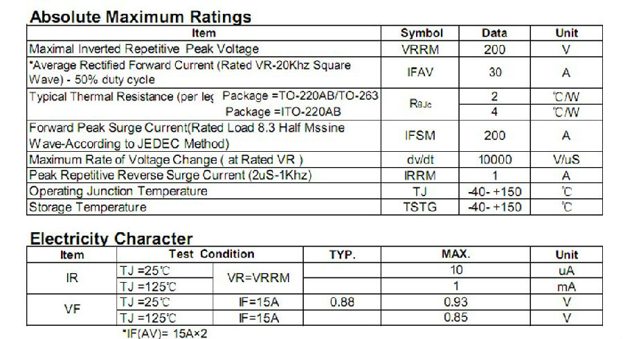 肖特基二极管MBR30200H参数规格: