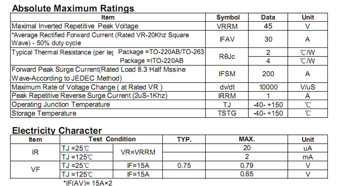 典型参数:30A 45V 正向电流(Io):30A 反向耐压(Vrr):45V