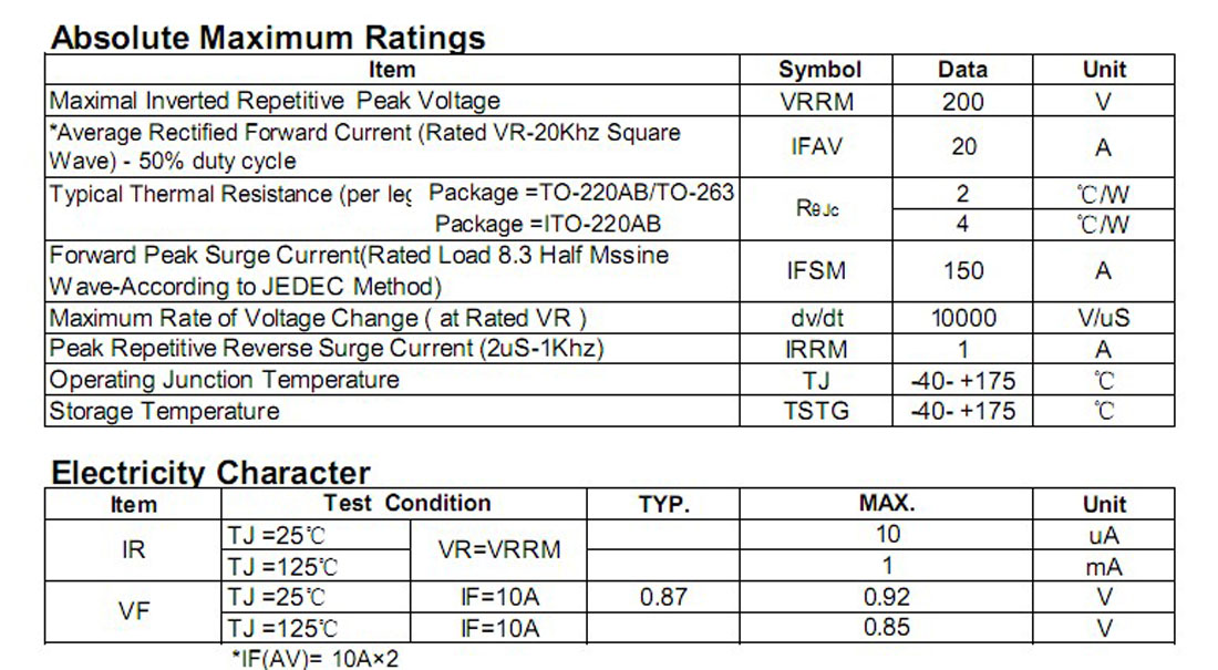肖特基二极管MBR20200PT参数规格: