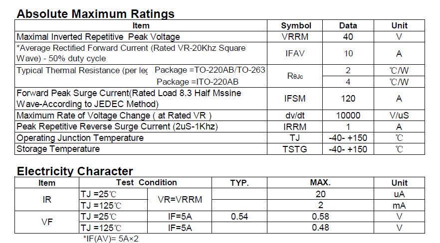 肖特基二极管MBR1040CD参数规格: