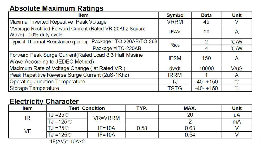 肖特基二极管MBR2045CD管装:50/管;盒装:1000PCS/盒。