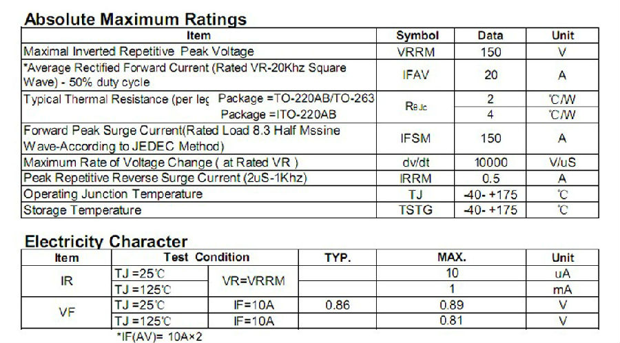 肖特基二极管MBR20150CD参数规格: