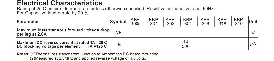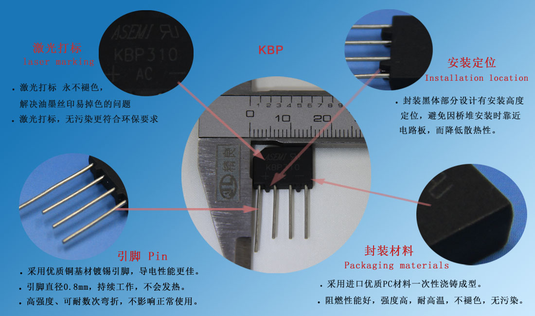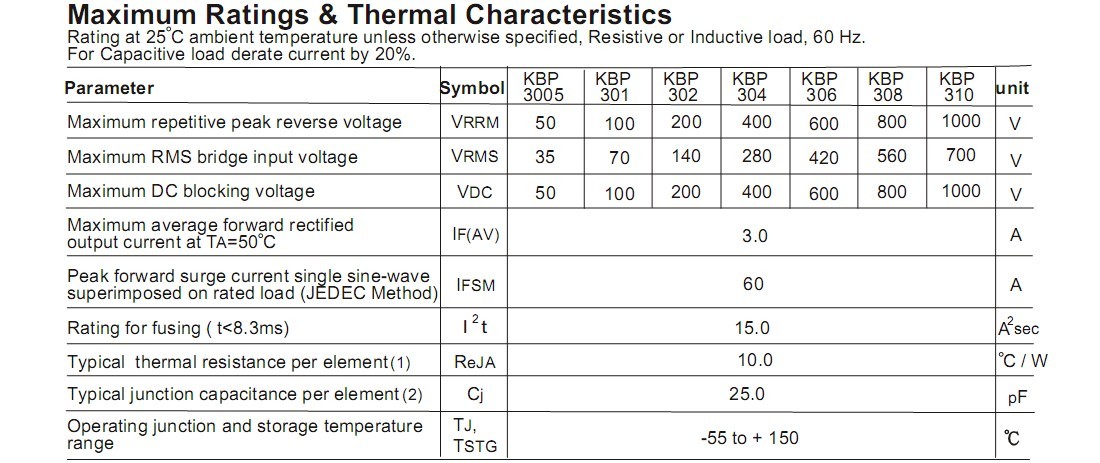 KBP310整流桥(封装 KBP-4 扁桥) 参数规格:电流:3A ;电压:1000V ;盒装:500PCS/盒;5K/箱。