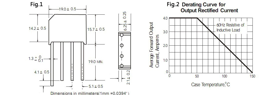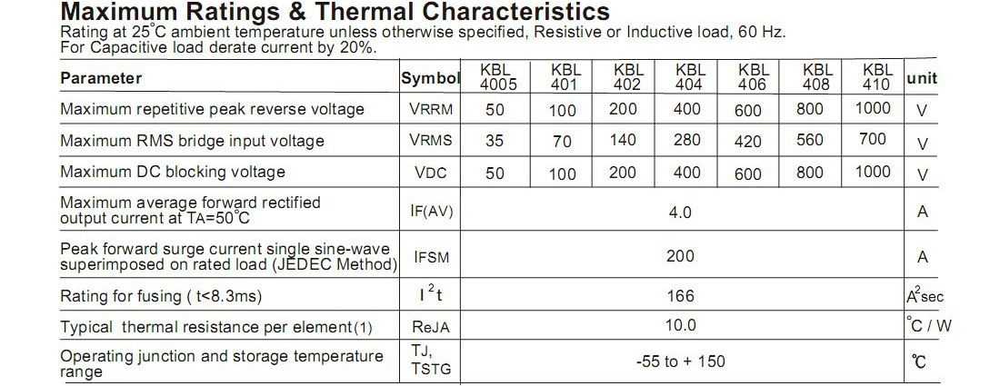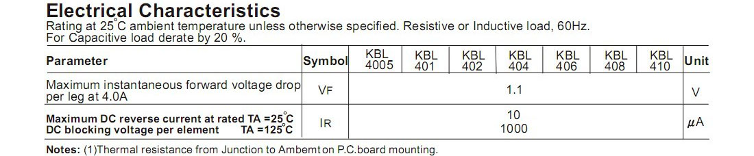 KBL406整流桥(封装 KBL-4 扁桥) 参数规格:电流:4.0A ;电压:600V ;盒装:500PCS/盒; 5K/箱