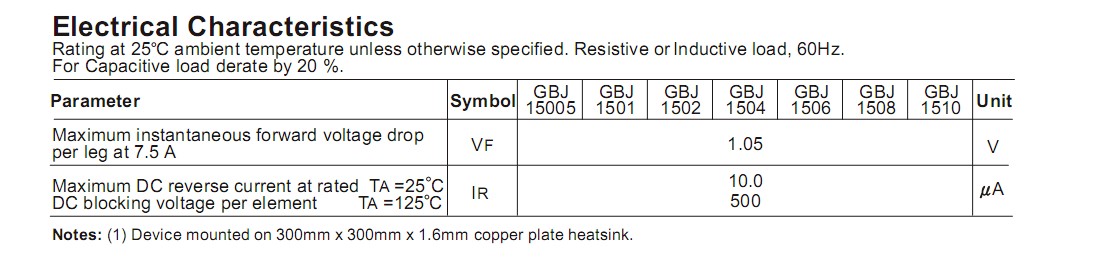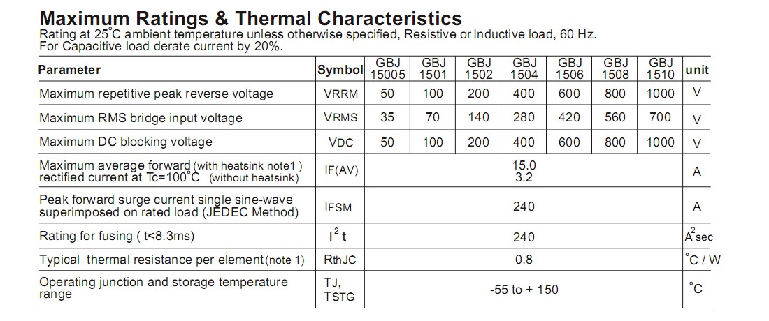 GBJ1510整流桥(封装 GBJ-4 扁桥) 参数规格:电流:15A ;电压:1000V ;包装方式:250PCS/盒,4K/箱。主要应用于小电流领域产品,