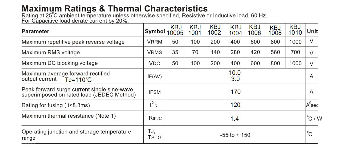 KBJ1008整流桥(封装 KBJ-4 扁桥) 参数规格:电流:10A ;电压:800V ;包装方式:250PCS/盒,4K/箱。主要应用于小电流领域产品,小